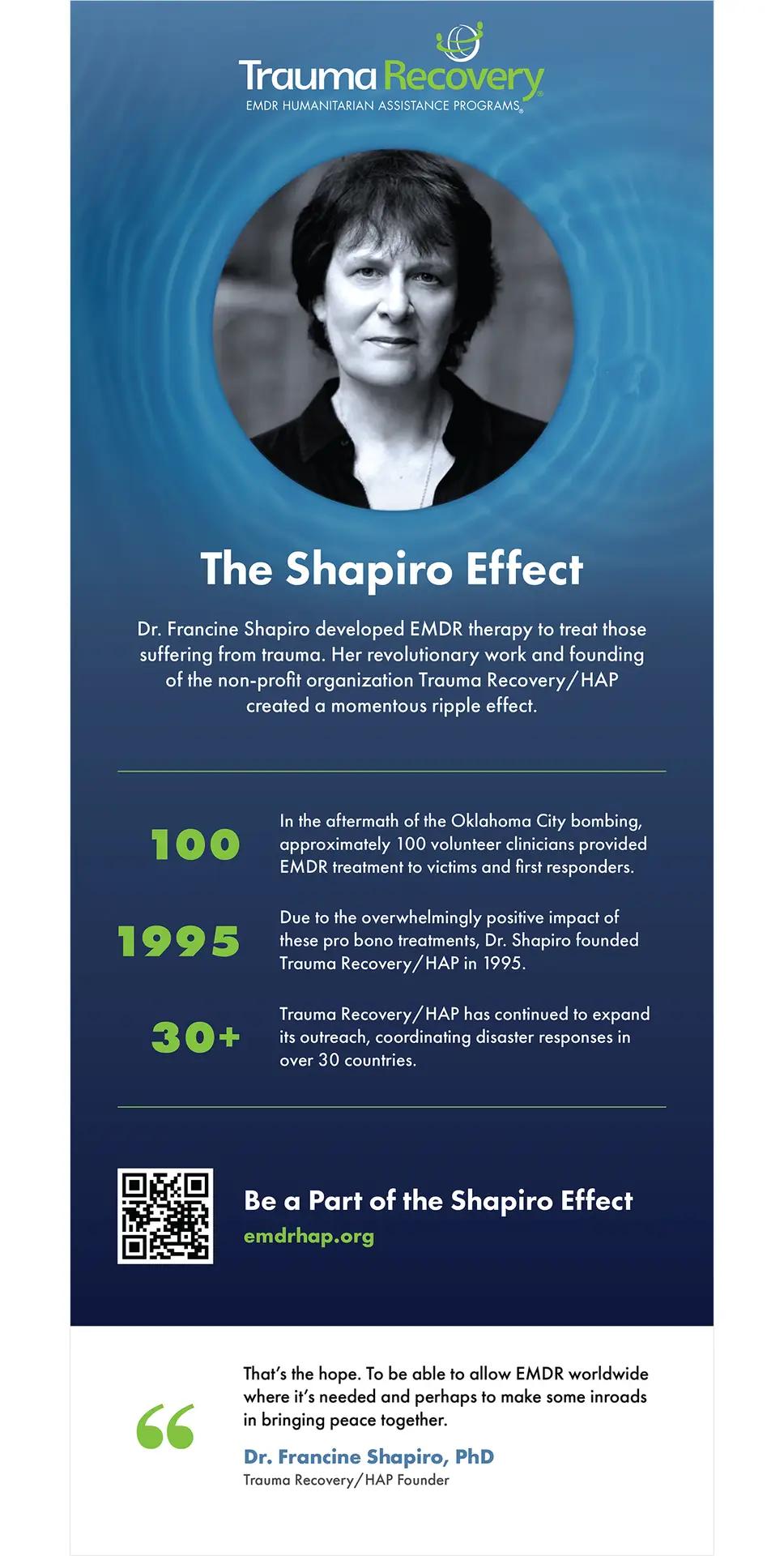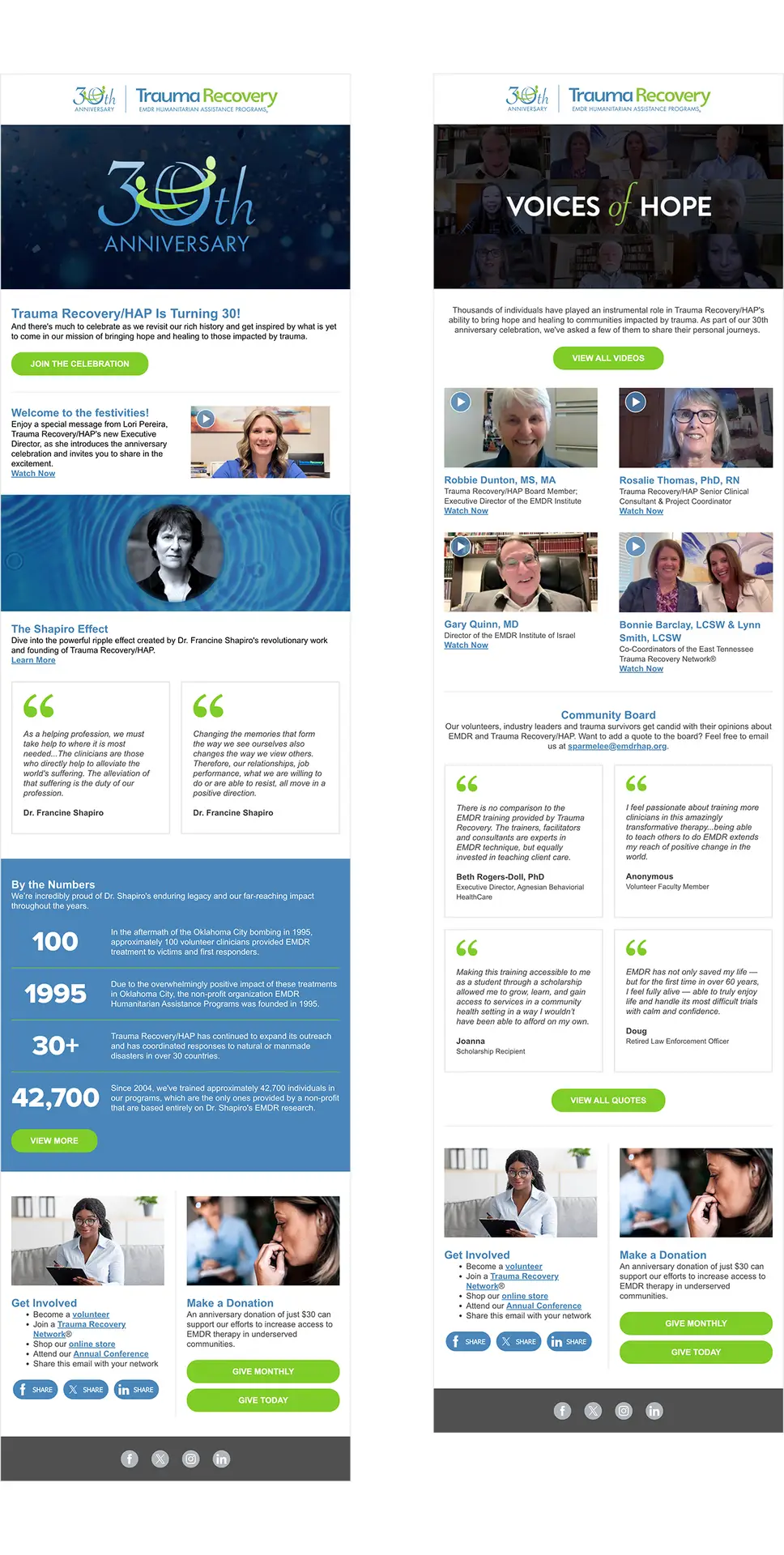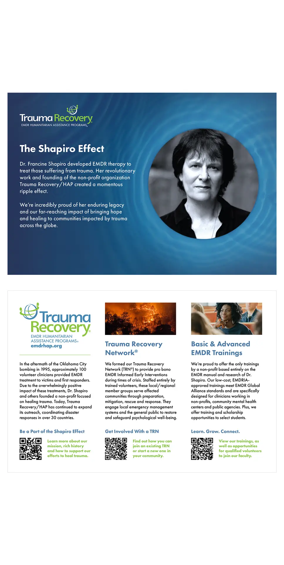 Dr. Francine Shapiro developed Eye Movement Desensitization and Reprocessing (EMDR) therapy to treat those suffering from trauma. After an overwhelmingly positive impact of their response to the Oklahoma City bombing in 1995, Dr. Shapiro and others founded the nonprofit organization Trauma Recovery, EMDR Humanitarian Assistance Programs. In celebration of their 30th anniversary and Dr. Shapiro’s revolutionary work, we developed a year-long campaign called the Shapiro Effect. Campaign assets included a “Voices of Hope” video series with the organization’s pioneers and current leaders, an anniversary landing page, print materials for their annual conference and a paid social campaign.