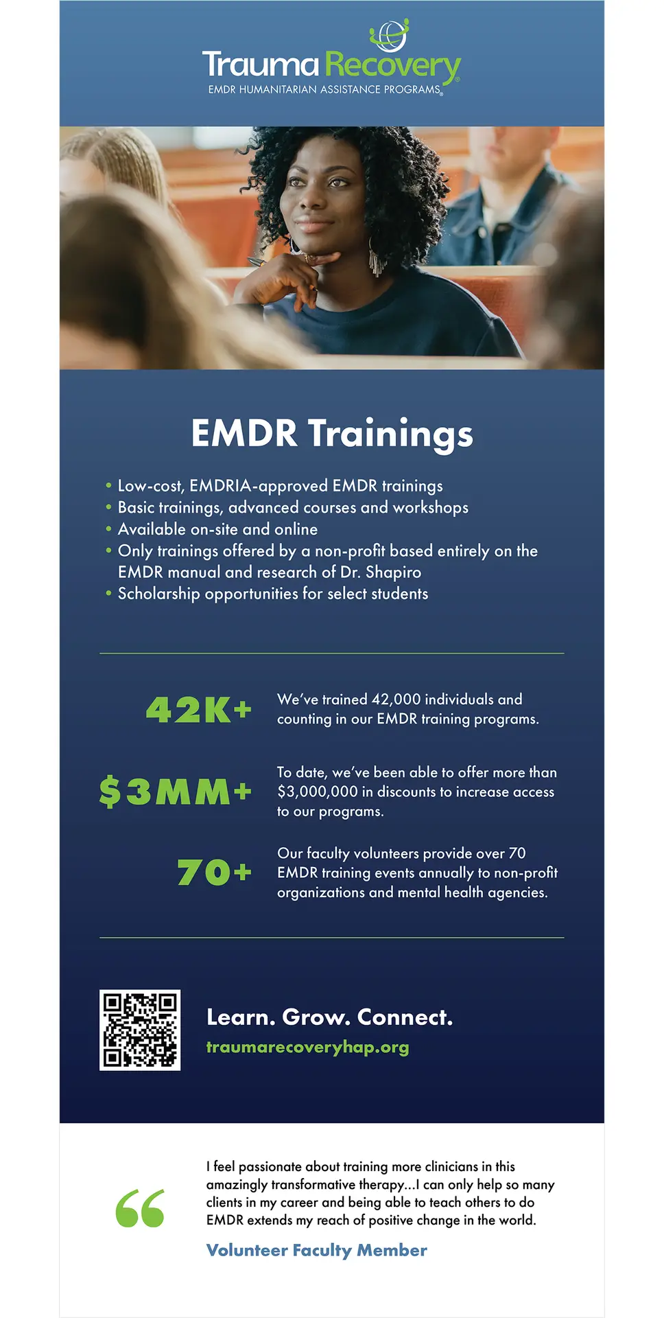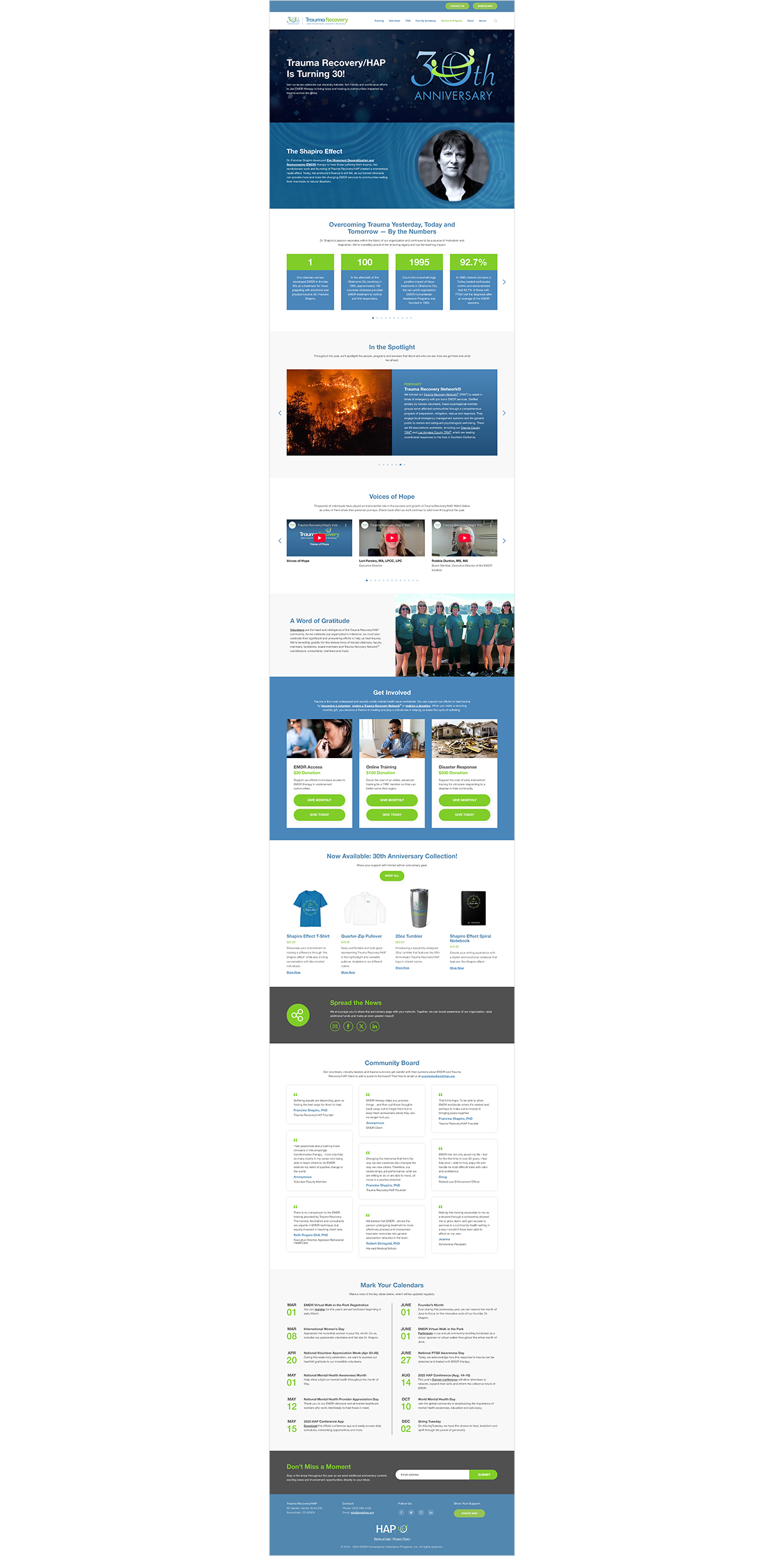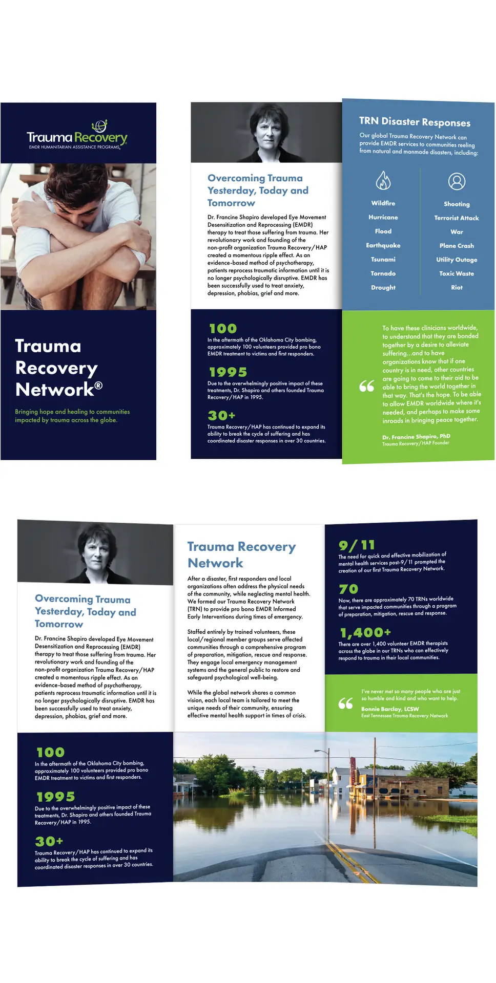 Dr. Francine Shapiro developed Eye Movement Desensitization and Reprocessing (EMDR) therapy to treat those suffering from trauma. After an overwhelmingly positive impact of their response to the Oklahoma City bombing in 1995, Dr. Shapiro and others founded the nonprofit organization Trauma Recovery, EMDR Humanitarian Assistance Programs. In celebration of their 30th anniversary and Dr. Shapiro’s revolutionary work, we developed a year-long campaign called the Shapiro Effect. Campaign assets included a “Voices of Hope” video series with the organization’s pioneers and current leaders, an anniversary landing page, print materials for their annual conference and a paid social campaign.